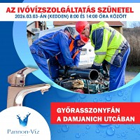 Társaságunk 2026. március 4-én (szerdán) ivóvízhálózat rekonstrukciós munkákat végez Győrasszonyfa településen. Részletek itt...