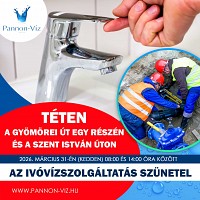 Társaságunk 2026. március 31-én (kedden) ivóvízhálózat rekonstrukciós munkákat végez Tét településen. A munkavégzés ideje alatt az ivóvízszolgáltatás szünetelésére lehet számítani az alábbi részeken...Részletek itt...