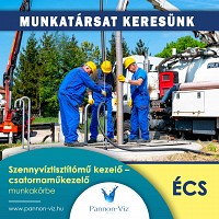 Munkatársat keresünk a PANNON-VÍZ Zrt. écsi szennyvíztisztító telepre szennyvíztisztítómű kezelő – csatornaműkezelő munkakörbe. Részletek itt...