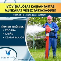 A Pannon-Víz Zrt. Csorna, Farád és Csatárimajor területén tavaszi karbantartási és tisztítási munkálatokat végez a vízhálózaton, a vízminőség megóvása érdekében. A munkálatok az alábbi helyszíneken és időpontokban zajlanak, este 22:00 és reggel 4:00 óra között... Részletek itt...